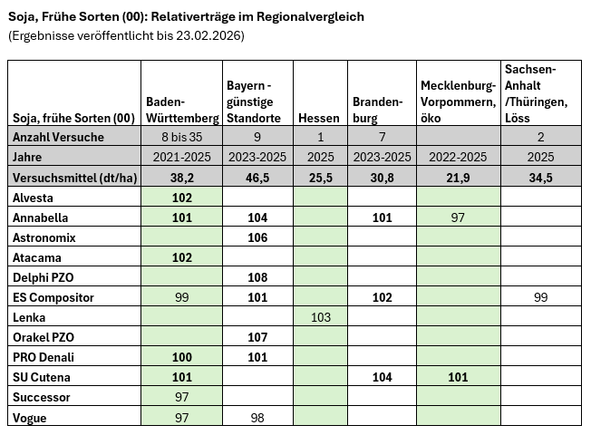 Baden-Würtemberg: Soja sehr früh (000) 2025 (ltz.landwirtschaft-bw.de), Soja früh (00) 2025 (ltz.landwirtschaft-bw.de)