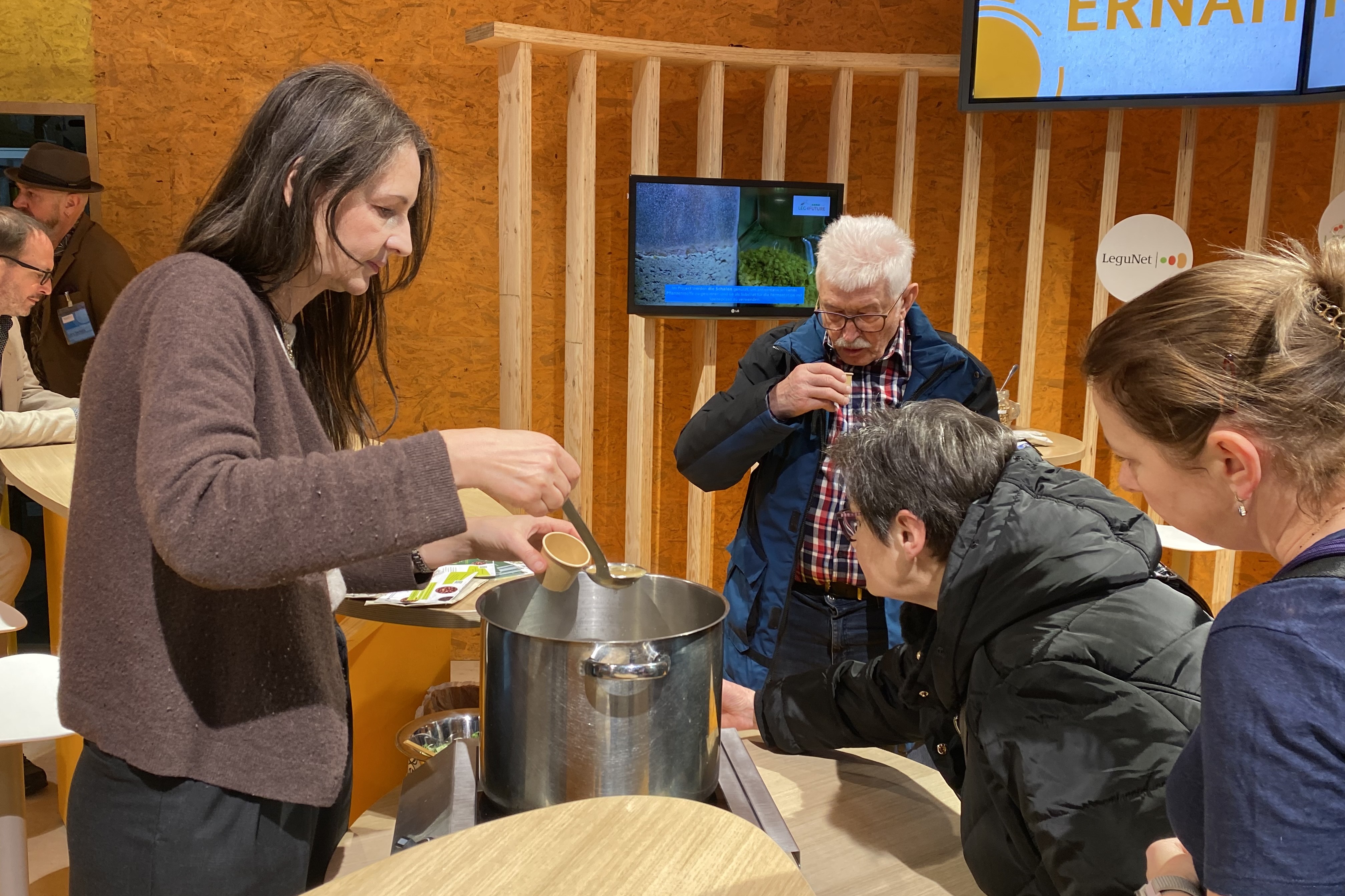 Das Leguminosen-Netzwerk zeigte auf der Internationalen Grünen Woche 2024 in Berlin zahlreiche Köstlichkeiten aus Hülsenfrüchten. Gemeinsam mit der Eiweißpflanzenstrategie informierten Mitarbeitende des Netzwerks über Anbau und Verwendung von Hülsenfrüchten und diskutierten mit Verbraucherinnen und Verbrauchern über den Stellenwert von Bohnen & Co. in der Ernährung.